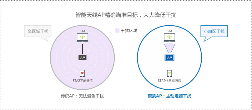 kaiyun开云官方在线入口科技的智能AP动态波束精确瞄准,大幅降低电磁干扰,同时能自动探测、发现有效信号源和干扰源,通过智能化的信号靶向控制,瞄准有效信号源,避开干扰源。根据用户位置和接收灵敏度,无线信号自动调整形成自适应反馈系统,利用各个移动用户间信号空间特征的差异,通过阵列天线技术在同一信道上接收和发射多个移动用户信号而不发生相互干扰,使Wi-Fi信号传输更有效。在复杂环境下能提升性能10倍以上。普通AP已无法使用,智能AP能应付自如。