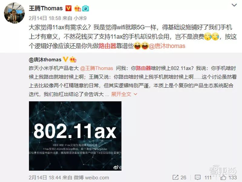 有趣的是,小米还曾就先铺设Wi-Fi 6移动终端设备还是传输设备的问题展开了“先有鸡还是先有蛋”的讨论,小米公司的产品总监王腾表示,Wi-Fi 6就像5G网络一样,如果没有基础设施铺设,提供再多的终端支持也没有意义。