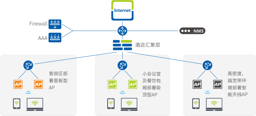 不同场景使用不同形态智能天线AP设备,以满足酒店多种无线网络覆盖需求。