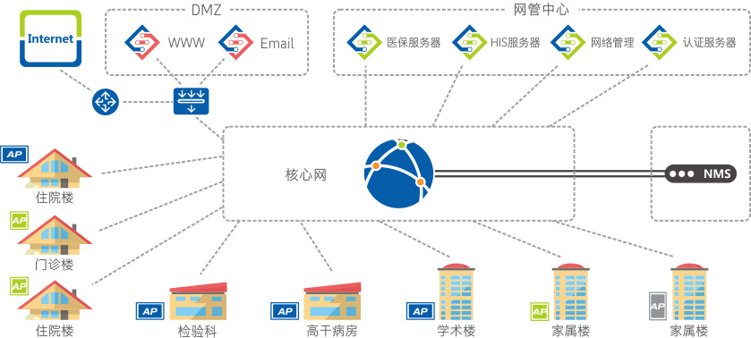 智能天线AP+云管理平台组网,适应各种网络环境,便捷部署,满足医院多种无线业务需要。